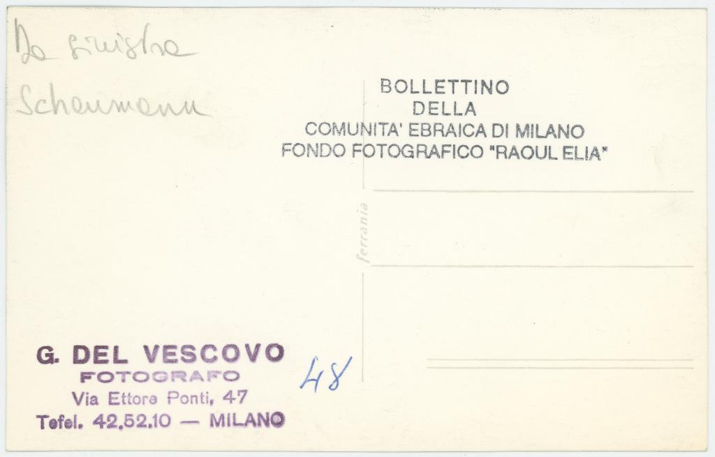 | timbri, marchi | sul verso del supporto il timbro a inchiostro nero "Bollettino della Comunità ebraica di Milano/ Fondo Fotografico "Raoul Elia" e il timbro a inchiostro blu con il marchio commerciale del fotografo |