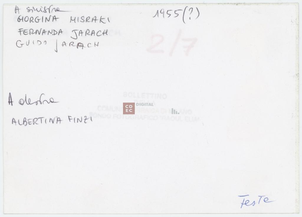 | iscrizioni | sul verso del supporto le indicazioni manoscritte a penna "A sinistra/ Giorgina Misraki/ Fernanda Jarach/ Guido Jarach/ A destra/ Albertina Finzi" |