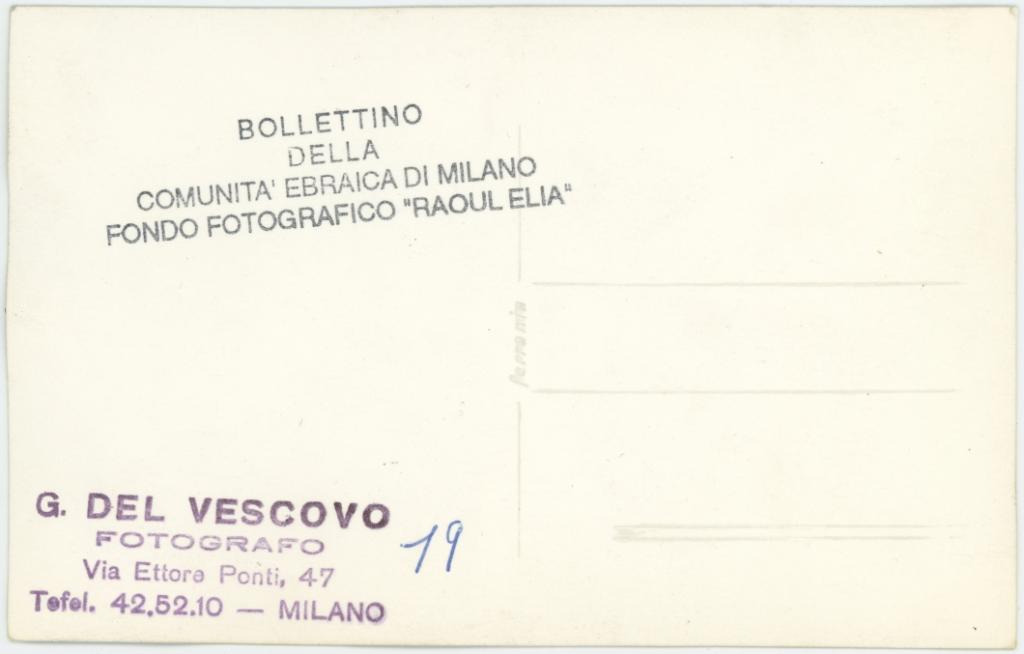 | timbri, marchi | sul verso del supporto il timbro a inchiostro "Bollettino della Comunità ebraica di Milano/ Fondo Fotografico Raoul Elia" e il timbro a inchiostro blu con il marchio commerciale del fotografo |