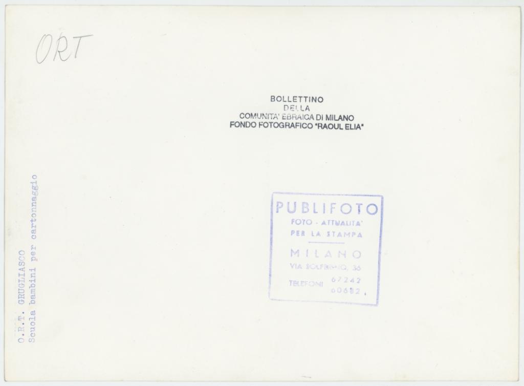 | timbri, marchi | sul verso del supporto il timbro a inchiostro blu con il marchio commerciale del fotografo e il timbro a inchiostro nero con la scritta "Bollettino della Comunità ebraica di Milano/ Fondo fotografico "Raoul Elia" |