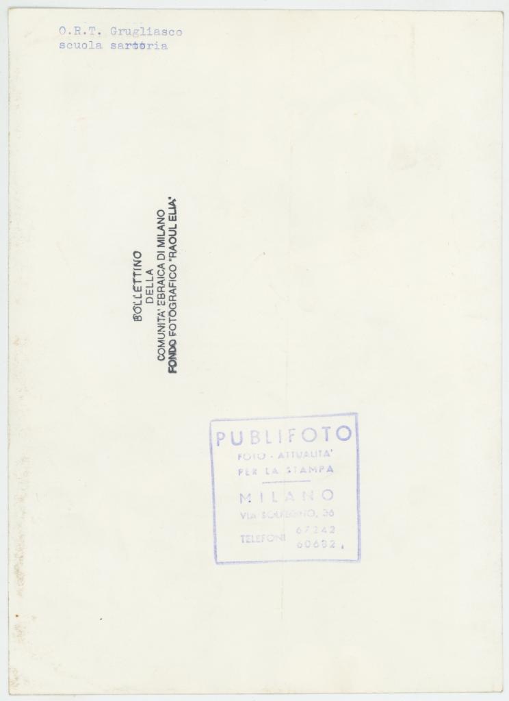 | timbri, marchi | sul verso del supporto il timbro a inchiostro "Bollettino della Comunità ebraica di Milano/ Fondo Fotografico Raoul Elia" |