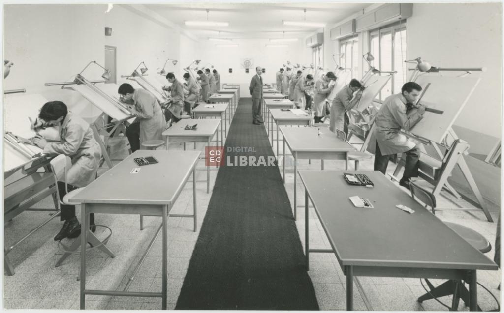 | titolo attribuito | Ritratto di alcuni allievi nell'aula di disegnatori attrezzisti e progettisti del distaccamento delle scuole O.R.T di Milano |