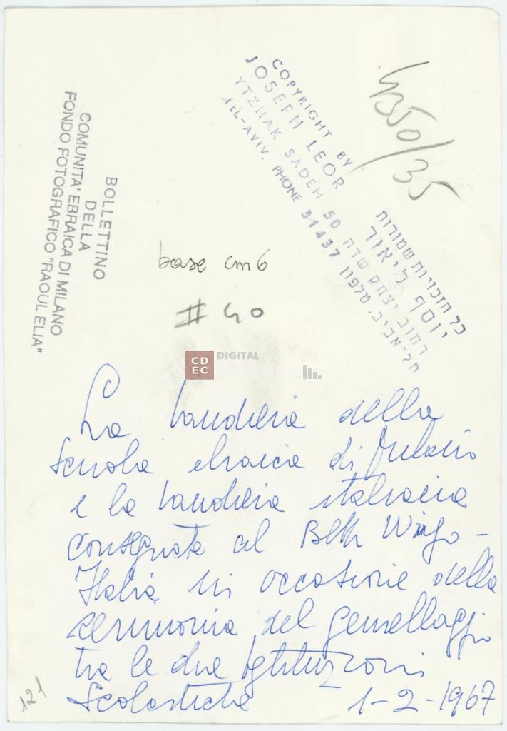| timbri, marchi | sul verso del supporto il timbro a inchiostro "Bollettino della Comunità ebraica di Milano/ Fondo Fotografico Raoul Elia" e il timbro a inchiostro blu con la scritta "Copyright by Joseph Leor/ Ytzhak Sadeh 50/ Tel-Aviv Phone 31437 [scritta in inglese e in ebraico]" |