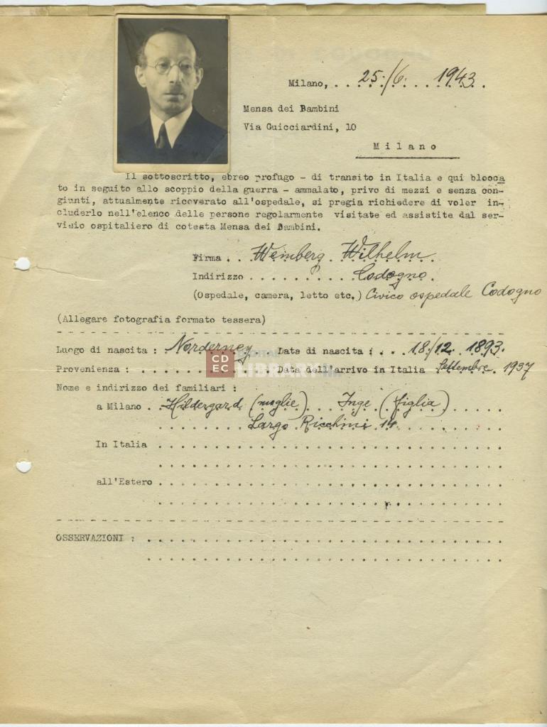| osservazioni | Wilhelm Weinberg fa richiesta all'Opera Mensa dei bambini per ricevere l'assistenza ospitaliera presso il Civico ospedale di Codogno. Da un certificato allegato al modulo risulta che il paziente รจ degente nel comparto chirurgico dell'ospedale dall'11 aprile 1943 |