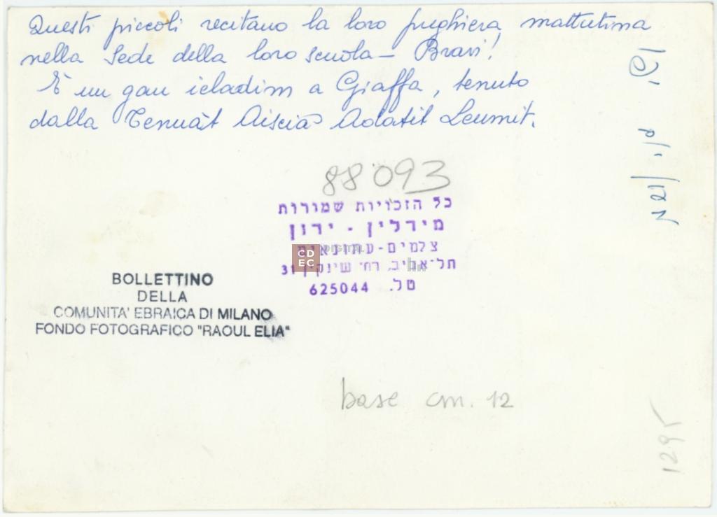 | iscrizioni | sul verso del supporto la didascalia manoscritta a penna "Questi piccoli recitano la loro preghiera mattutina nella Sede della loro scuola. Bravi! / E' un gam ieladim [trad. giardino d'infanzia] a Giaffa, tenuto dalla Tenuàt Aiscià Adatit Leumit [trad. Movimento nazionale della donna religiosa]" e indicazioni tipografiche |