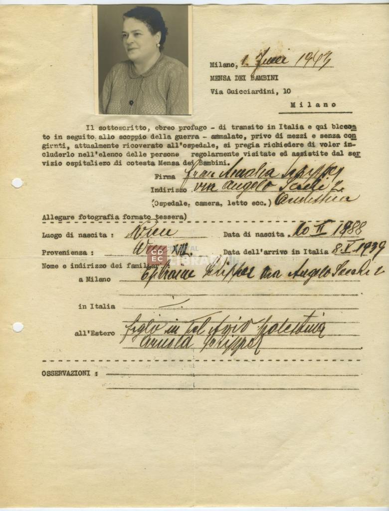 | osservazioni | Il 1° giugno 1943 Frau Amalia [?] in Schipper fa richiesta all'Opera Mensa dei bambini per ricevere l'assistenza ospitaliera presso il suo domicilio in via Angelo Sacchi 2 a Milano |
