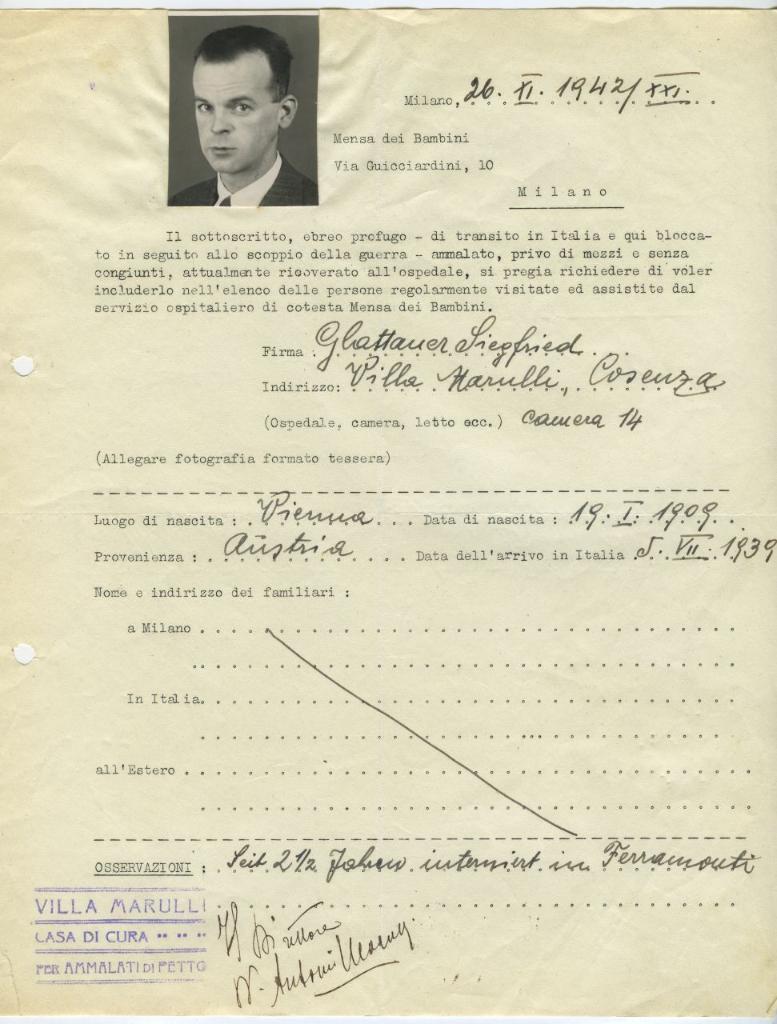 | osservazioni | Siegried Glattauer fa richiesta all'Opera Mensa dei bambini per ricevere l'assistenza ospitaliera presso la casa di cura Villa Marulli per ammalati di petto di Cosenza |