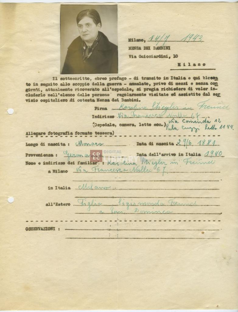 | osservazioni | Il 14 luglio 1943 Karolina Stiegler in Freund fa nuovamente richiesta all'Opera Mensa dei bambini per ricevere l'assistenza ospitaliera presso la Clinica Ostetrico-ginecologica "Luigi Mangiagalli" di Milano |