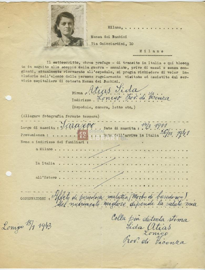 | osservazioni | Il 15 gennaio 1943 Sida Atias fa richiesta all'Opera Mensa dei bambini per ricevere l'assistenza ospitaliera presso il paese di Lonigo |