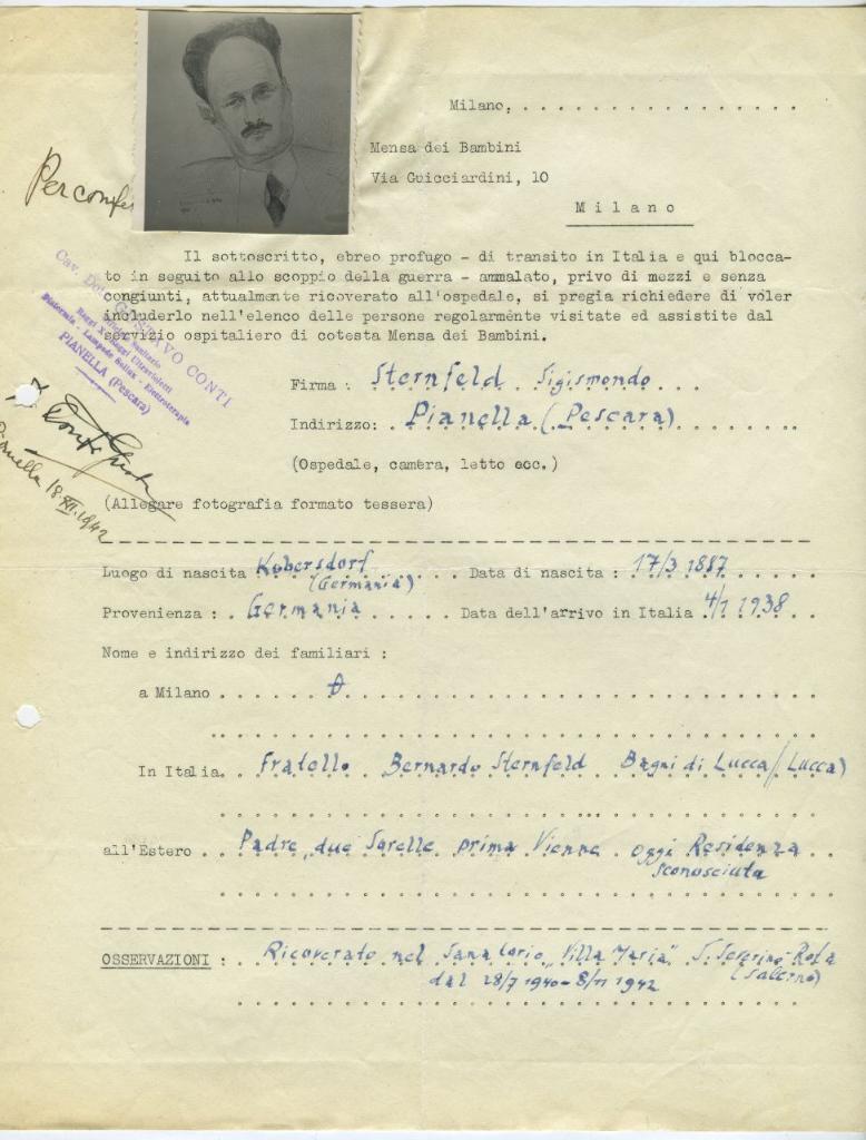 | osservazioni | Il 18 dicembre 1942 Sigismondo Sternfeld fa richiesta all'Opera Mensa dei bambini per ricevere l'assistenza ospitaliera presso il paese di Pianella. Come indicato nelle Osservazioni dal 28 luglio 1940 all'8 novembre 1942 รจ ricoverato nel Sanatorio Villa Maria S. Severino Rota (oggi Mercato San Severino in provincia di Salerno). Nel modulo viene inserito, al posto del ritratto fotografico in formato tessera, una riproduzione di un suo ritratto grafico eseguito da un artista non identificato a San Severino il 16 settembre 1940. |