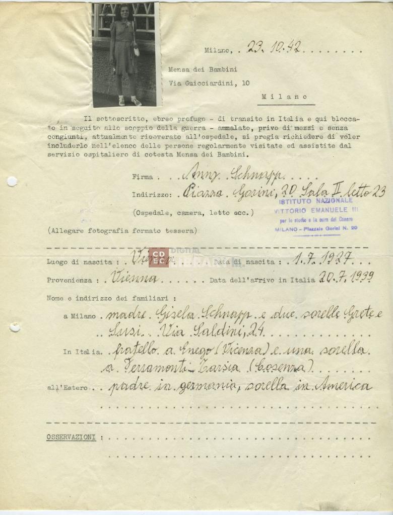 | osservazioni | Il 23 ottobre 1942 Anny Schnapp fa richiesta all'Opera Mensa dei bambini per ricevere l'assistenza ospitaliera presso l'Istituto nazionale Vittorio Emanuele III per lo studio e la cura del Cancro di piazzale Gorini 20 a Milano |