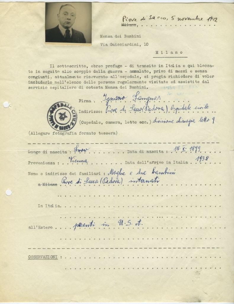 | osservazioni | Il 5 novembre 1942 Ignazio Langnas fa richiesta all'Opera Mensa dei bambini per ricevere l'assistenza ospitaliera presso l'Ospedale civile di Piove di Sacco |
