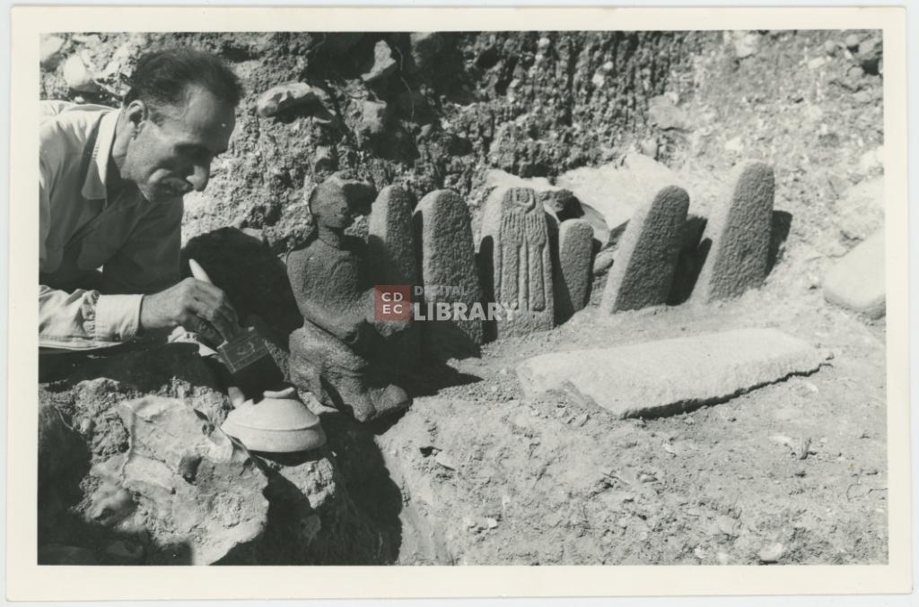 titolo attribuito | Ritratto dell'archeologo Igal Yadin nell'area delle steli di culto nel sito archeologico di Hazor in Israele |