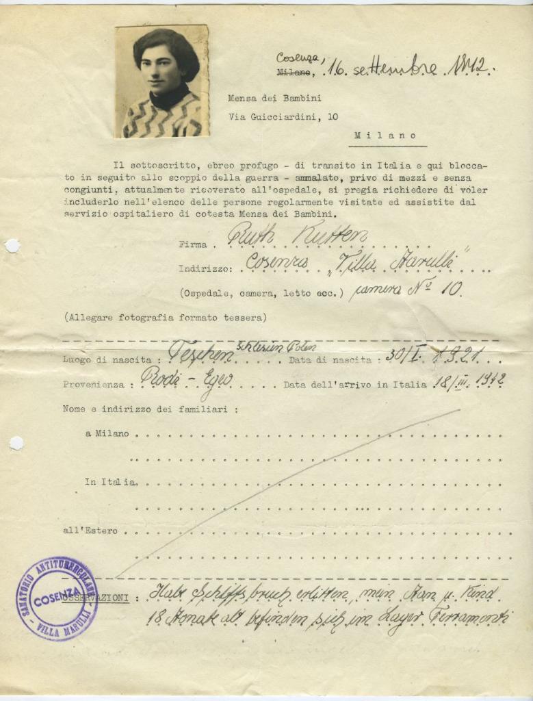 | osservazioni | Il 16 settembre 1942 Ruth Better in Kutten fa richiesta all'Opera Mensa dei bambini per ricevere l'assistenza ospitaliera presso il Sanatorio Antitubercolare Villa Marulli di Cosenza |