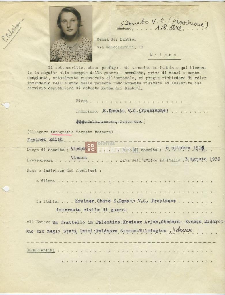 | osservazioni | Il 1° agosto 1942 Edith Kreiner, internata a San Donato Val Comino, fa richiesta all'Opera Mensa dei bambini per ricevere l'assistenza ospitaliera. Si segnala che sul modulo è riportato in alto a sinistra il nome di Padre Callisto |