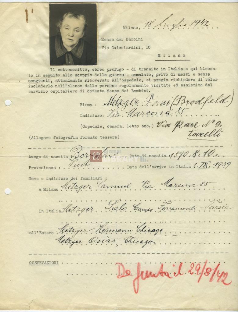 | osservazioni | Il 18 luglio 1942 Fanni Brodfeld in Metzger fa richiesta all'Opera Mensa dei bambini per ricevere l'assistenza ospitaliera presso l'Ospedale Policlinico di Milano |