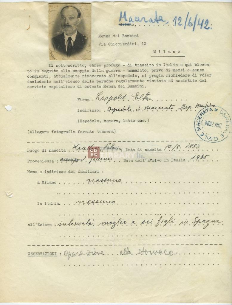 | osservazioni | Il 12 giugno 1942 Leopold Elter fa richiesta all'Opera Mensa dei bambini per ricevere l'assistenza ospitaliera presso l'Ospedale civile di Macerata |