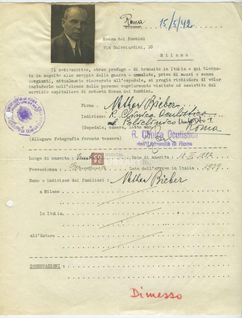 | osservazioni | Il 15 maggio 1942 Nathan Bieber fa richiesta all'Opera Mensa dei bambini per ricevere l'assistenza ospitaliera presso la R. Clinica Oculistica dell'Ospedale Policlinico Umberto I di Roma |