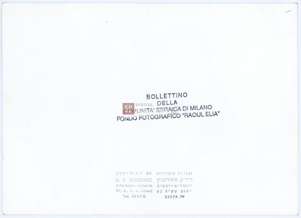 timbri, marchi | sul verso del supporto il timbro a inchiostro "Bollettino della Comunità ebraica di Milano/ Fondo Fotografico Raoul Elia" e "Copyright by Dr. K Meyerowitz/ Jerusalem - Rehavia/ 27, K.K.L. Street/ Tel. 39970" (in inglese e in ebraico) |