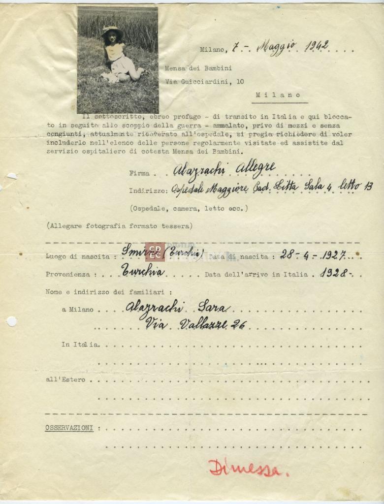 | osservazioni | Il 7 maggio 1942 Allegre Alazrachi fa richiesta all'Opera Mensa dei bambini per ricevere l'assistenza ospitaliera presso il padiglione Litta dell'Ospedale maggiore di Milano. Il cognome Alazrachi รจ talvolta trascritto nella forma Alazraki |