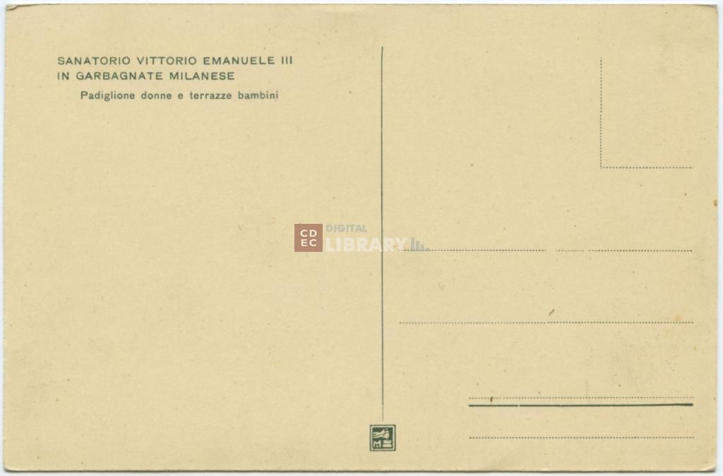 | iscrizioni | sul verso del supporto in alto a sinistra la didascalia tipografica "Sanatorio Vittorio Emanuele III in Garbagnate Milanese/ Padiglione donne e terrazze bambini" |