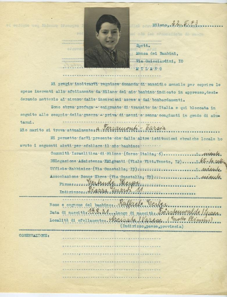 | osservazioni | Il 22 maggio 1943 Gertrude Herpe in Gerber fa domanda all'Opera Mensa dei Bambini per ricevere un sussidio mensile per suo figlio Raffaele Gerber sfollato ad Arcisate (Varese) a Crotto Plinius |