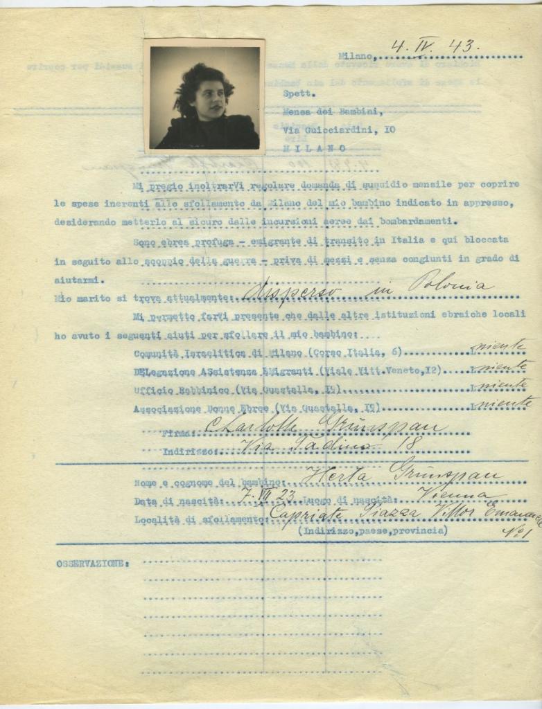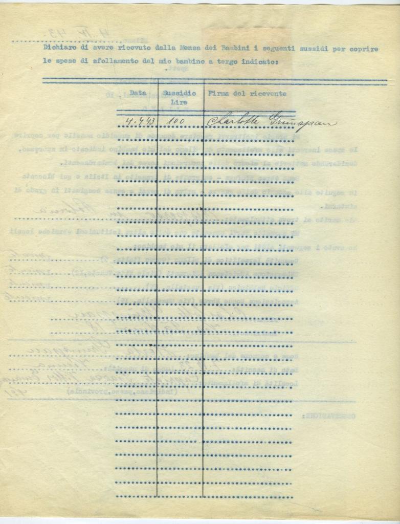 | osservazioni | Il 4 aprile 1943 Charlotte Grünspan fa domanda all'Opera Mensa dei Bambini per ricevere un sussidio mensile per sua figlia Herta Grünspan sfollata a Capriate (Bergamo) |