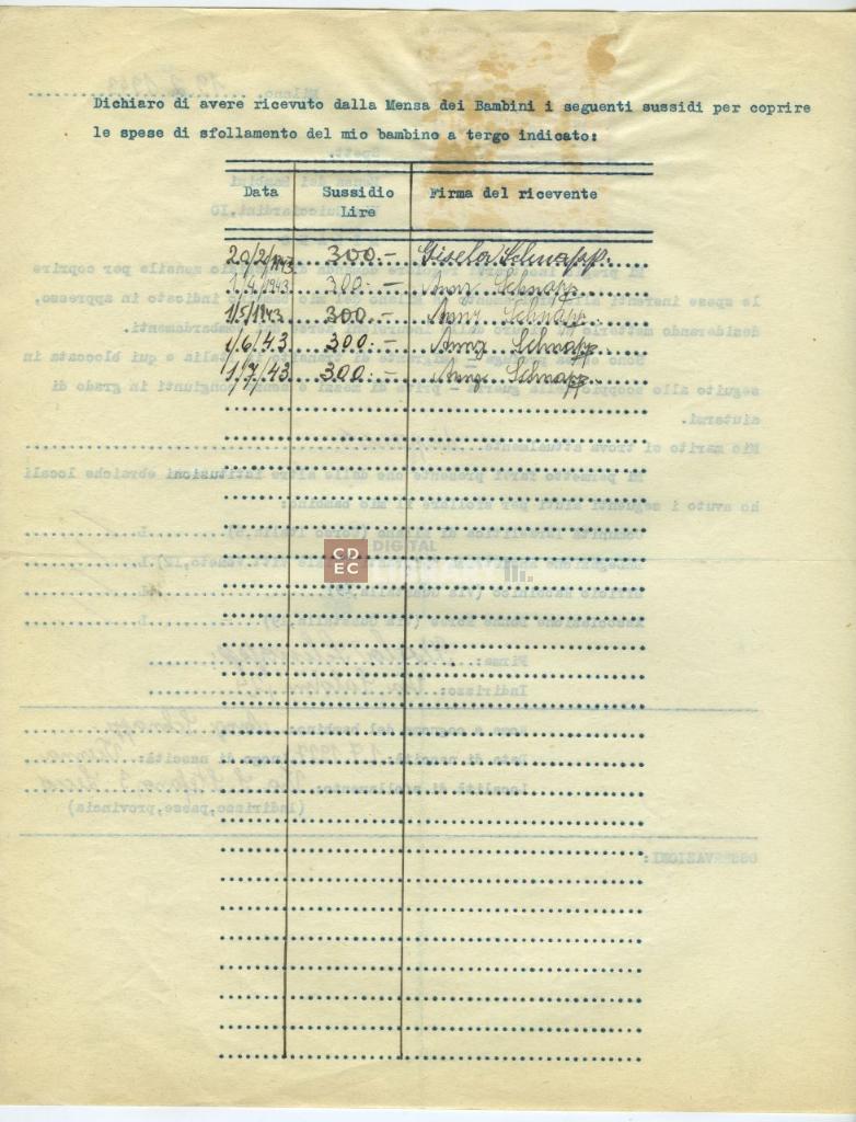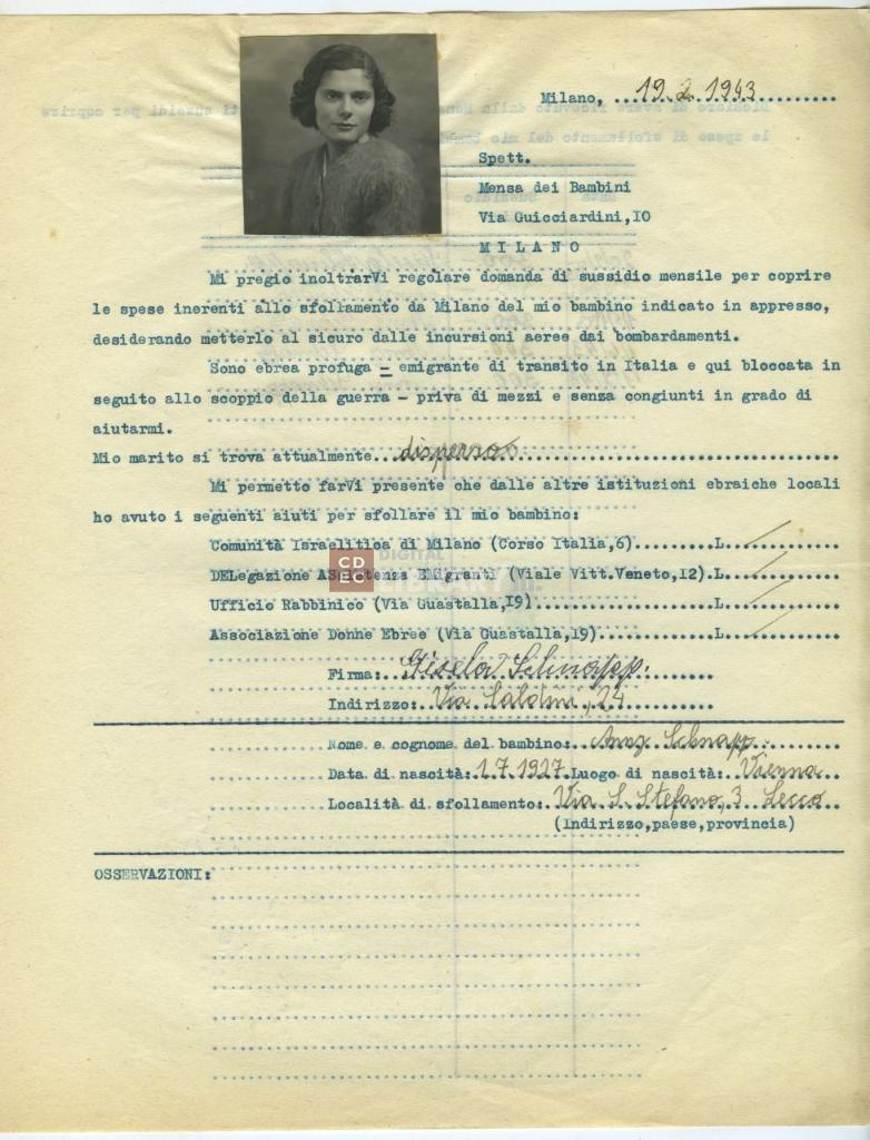 | osservazioni | Il 19 febbraio 1943 Gisela Schnapp fa domanda all'Opera Mensa dei Bambini per ricevere un sussidio mensile per sua figlia Anny Schnapp sfollata a Lecco |