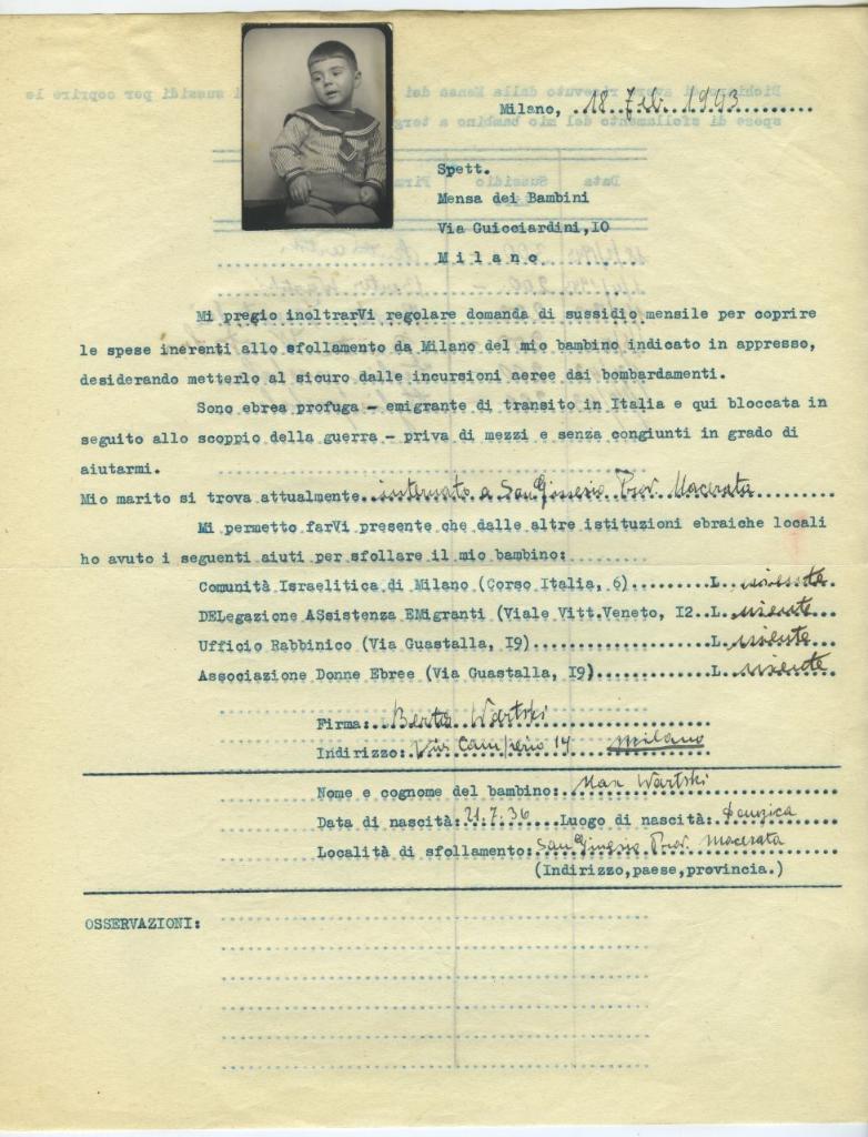 | osservazioni | Il 18 febbraio 1943 Berta Holdstein in Wartski fa domanda all'Opera Mensa dei Bambini per ricevere un sussidio mensile per suo figlio Max Wartski sfollato a San Ginesio (Macerata) |