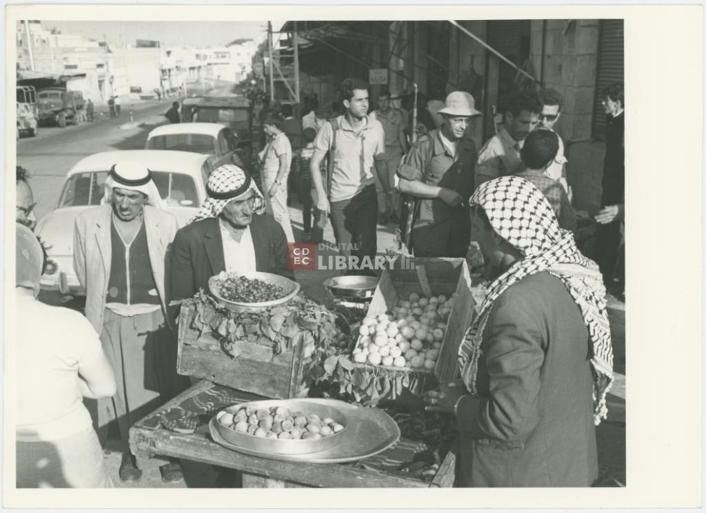 titolo attribuito | Ritratto di alcuni arabi intorno a un banco della frutta in una strada |