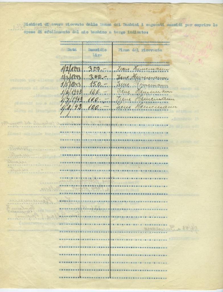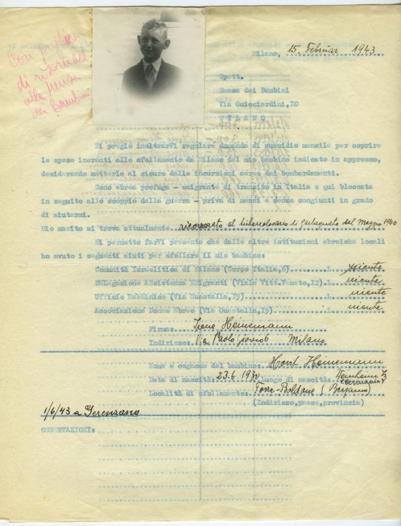 | osservazioni | Il 18 febbraio 1943 Irene Bruckmann in Heinemann fa domanda all'Opera Mensa dei Bambini per ricevere un sussidio mensile per suo figlio Horst Heinemann sfollato a Torre Boldone (Bergamo) |