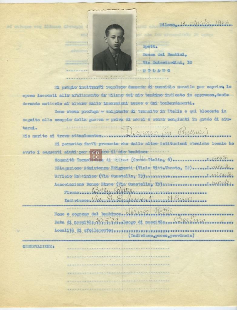 | osservazioni | Il 18 aprile 1943 Betty Retter fa domanda all'Opera Mensa dei Bambini per ricevere un sussidio mensile per suo figlio Werner Retter. L'incontro di Israel Kalk con Werner Retter, sua sorella Brigitte e altri bambini ebrei profughi darĂ avvio all'iniziativa della Mensa dei Bambini di via Guicciardini 10 a Milano |