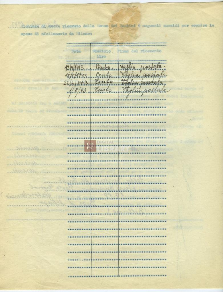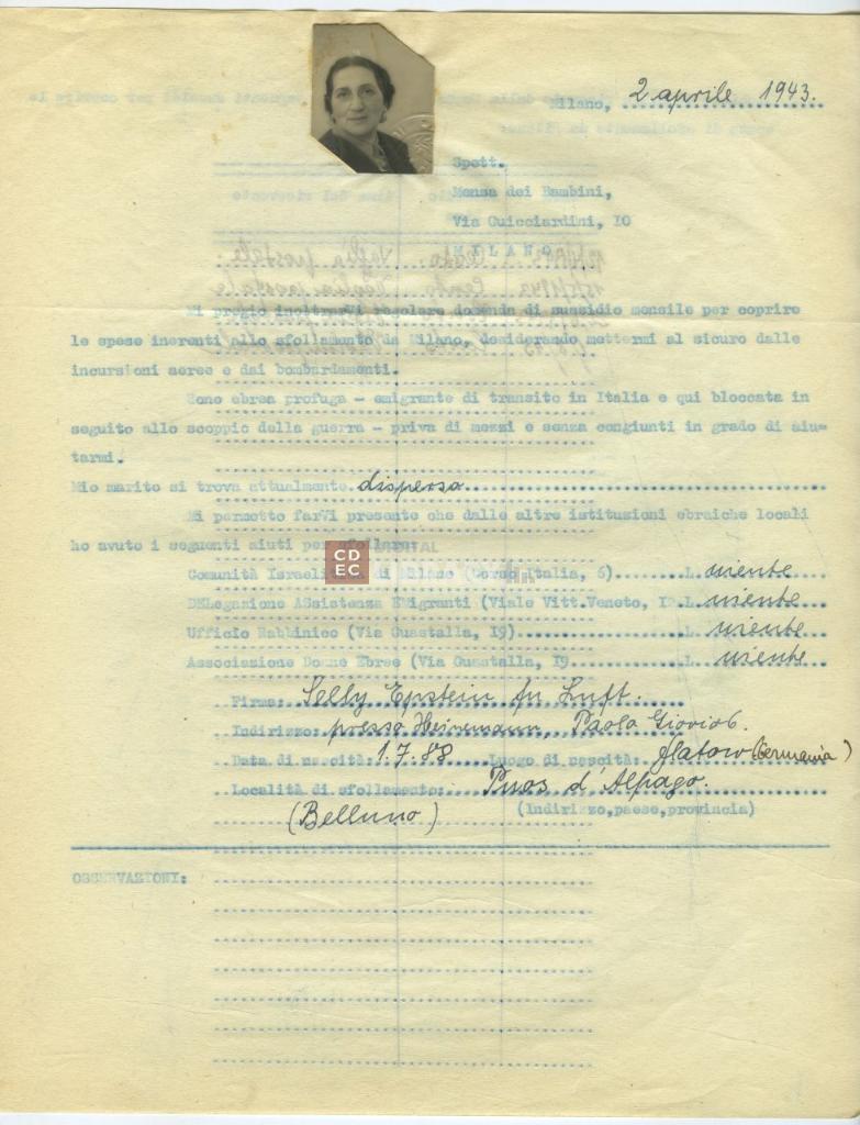 osservazioni | Il 2 aprile 1943 Selly Epstein, sfollata a Puos d'Alpago (Belluno), fa domanda all'Opera Mensa dei Bambini per ricevere un sussidio mensile |