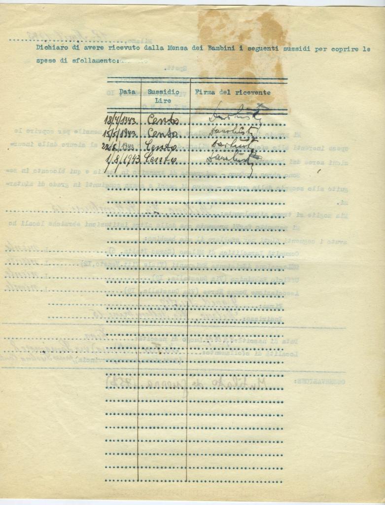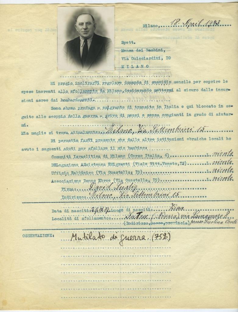 | osservazioni | Il 18 aprile 1943 David Lustig, sfollato a Intra (Novara), fa domanda all'Opera Mensa dei Bambini per ricevere un sussidio mensile |