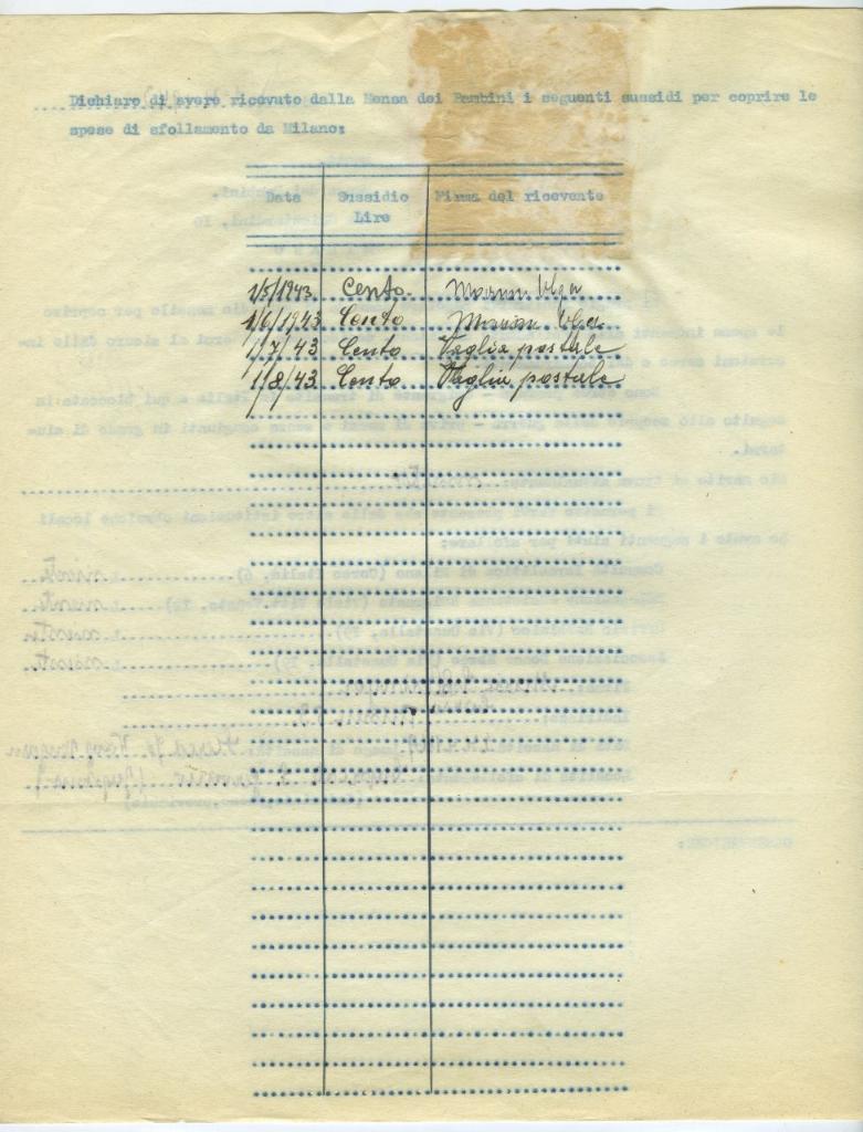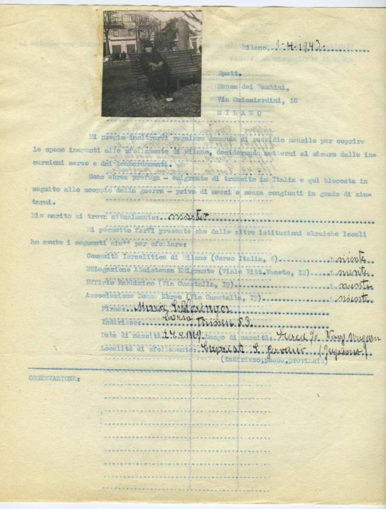 | osservazioni | Il 1° aprile 1943 Maria Sonnerfeld in Schlesinger, sfollata a Capriate San Gervasio (Bergamo), fa domanda all'Opera Mensa dei Bambini per ricevere un sussidio mensile |