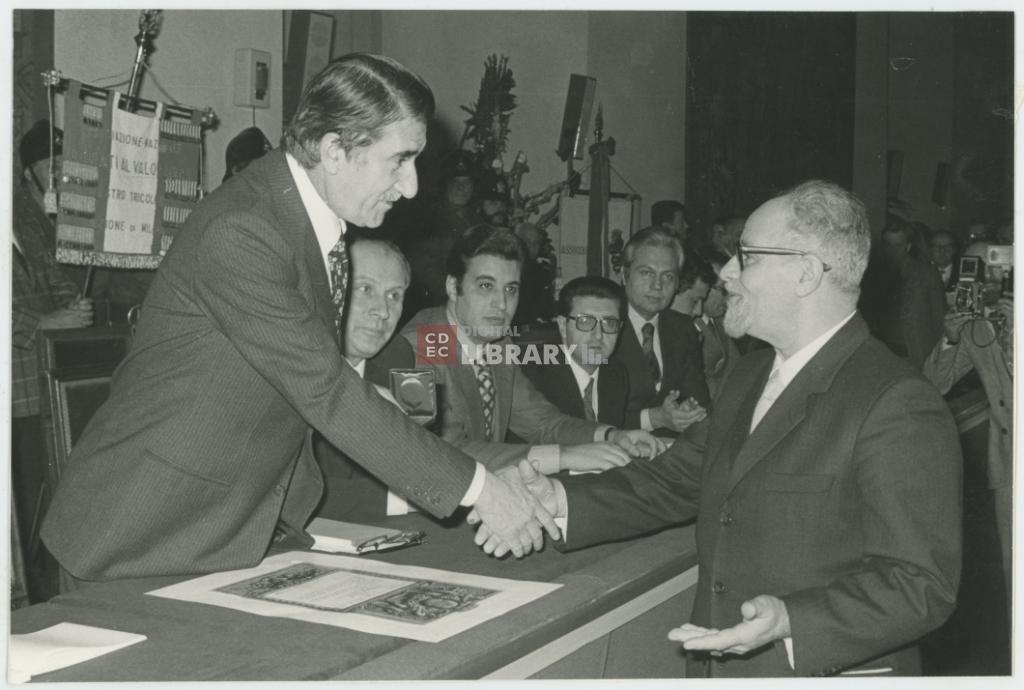 osservazioni | nella fotografia si riconoscono in primo piano Aldo Aniasi (a destra), sindaco di Milano dal 1967 al 1976, mentre stringe la mano a rav Elia Kopciowski (a sinistra) |