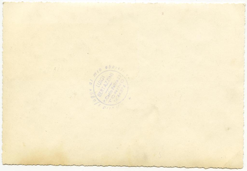 timbri, marchi | nell'immagine in basso a sinistra la scritta "Foto Bertazzini" - sul verso del supporto al centro timbro circolare a inchiostro blu con il marchio commerciale del fotografo che riporta lungo il bordo il motto tratto dal fotografo Silvio Ottolenghi "Nulla sfugge al mio obbiettivo" |