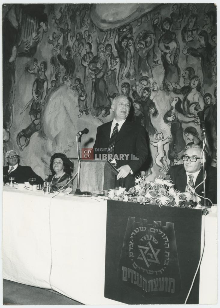 notizie storico-critiche | Al ricevimento parteciparono, oltre al Presidente dello Stato di Israele Ephraim Katzir, il il Ministro della Salute Victor Shemtov e il Presidente del Consiglio di Amministrazione Internazionale dell'ospedale Shaare Zedek Max Stern. Sul muro, alle spalle del tavolo degli oratori, si nota uno dettaglio del trittico dell'Antico Testamento, un arazzo opera di Marc Chagall e da lui stesso donato, che illustra la storia del popolo ebraico |