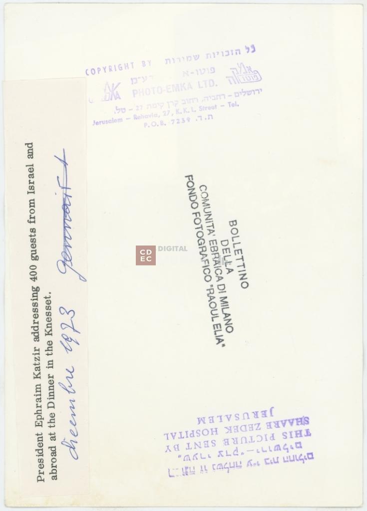 iscrizioni | sul verso del supporto secondario la didascalia dattiloscritta "President Ephraim Katzir addressing 400 guests from Israel and abroad at the Dinner in the Knesset" e la data manoscritta a penna "dicembre 1973" |
