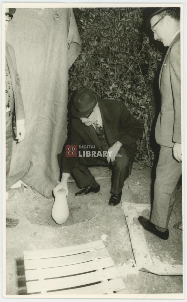 osservazioni | Nella fotografia al centro è ritratto il Commendatore Giuseppe Sinigaglia mentre interra l'anfora con la Meghilà durante la cerimonia della posa della prima pietra della sinagoga di Ramat Gan, presso i giardini pubblici di Gan Shaul. |