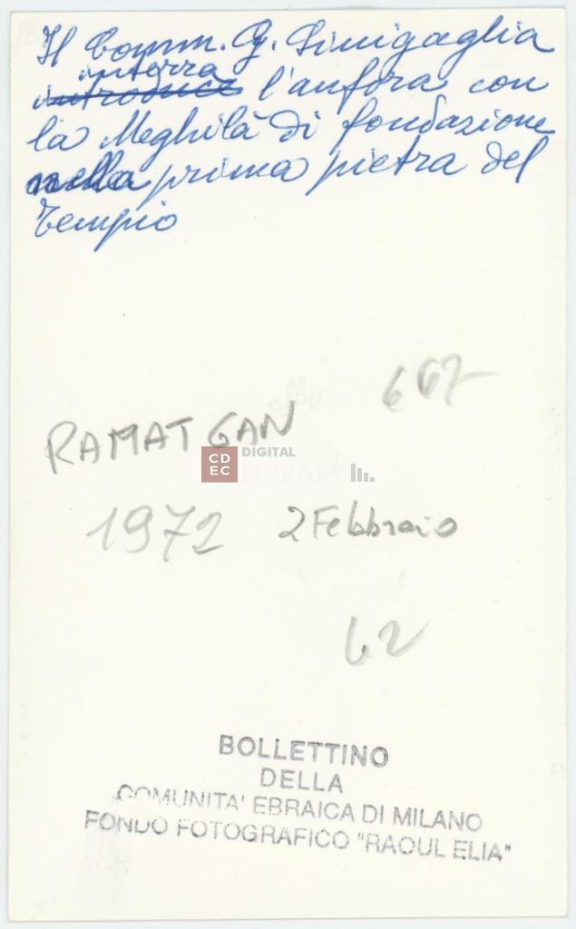 iscrizioni | sul verso del supporto l'iscrizione manoscritta a penna "Il Comm. G. Sinigallia interra l'anfora con la Meghilà di fondazione nella prima pietra del Tempio" e a matita "Ramat gan 1972 2 Febbraio" |