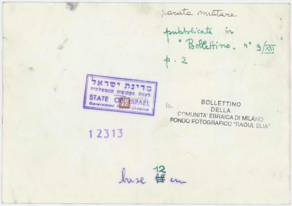 timbri, marchi | sul verso del supporto il timbro a inchiostro "Bollettino della Comunità ebraica di Milano/ Fondo Fotografico Raoul Elia" e il timbro a inchiostro blu "State of Israel/ Government Press Division" e il numero di inventario 12313 |