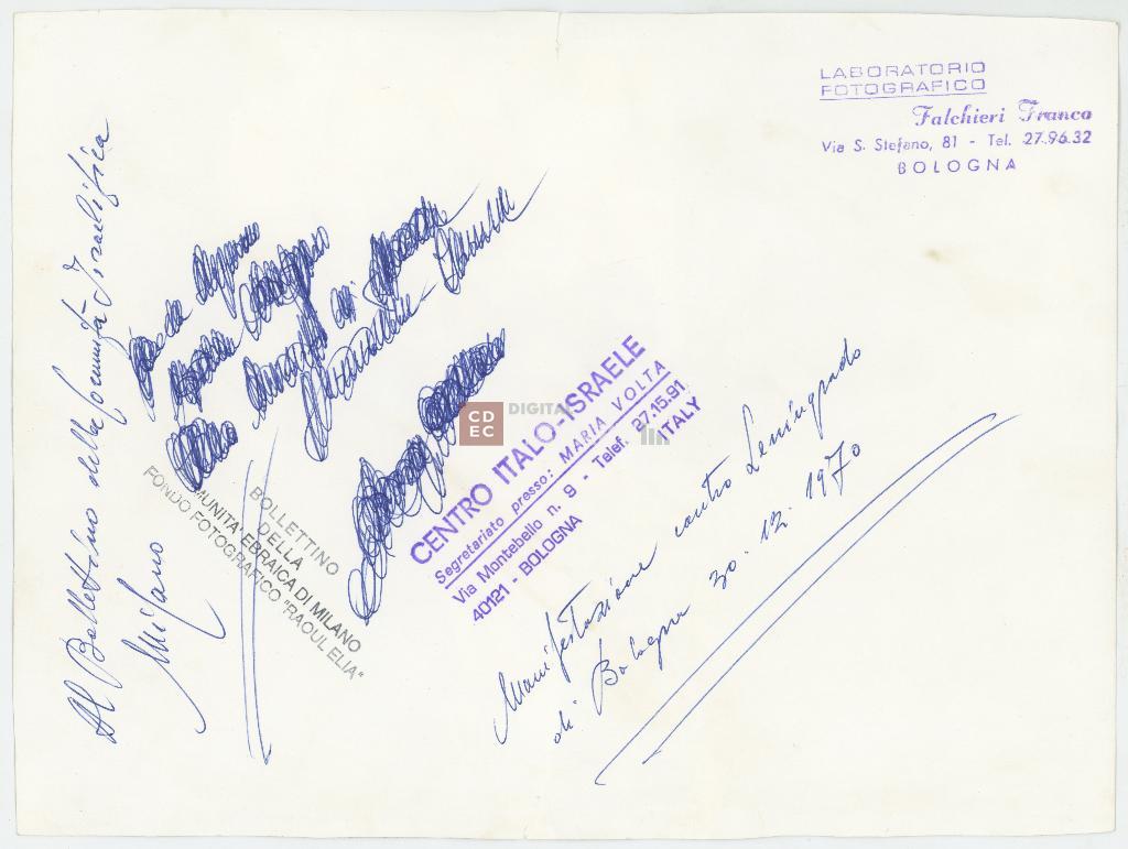 timbri, marchi | sul verso del supporto il timbro a inchiostro "Bollettino della Comunità ebraica di Milano/ Fondo Fotografico Raoul Elia", il timbro a inchiostro blu con la scritta "Centro Italo-Israele/ Segretariato presso: Maria Volta/ via Montebello n. 9 - Telef. 27.15.91/ 40121 - Bologna Italy" e il timbro a inchiostro blu con il marchio commerciale del fotografo |