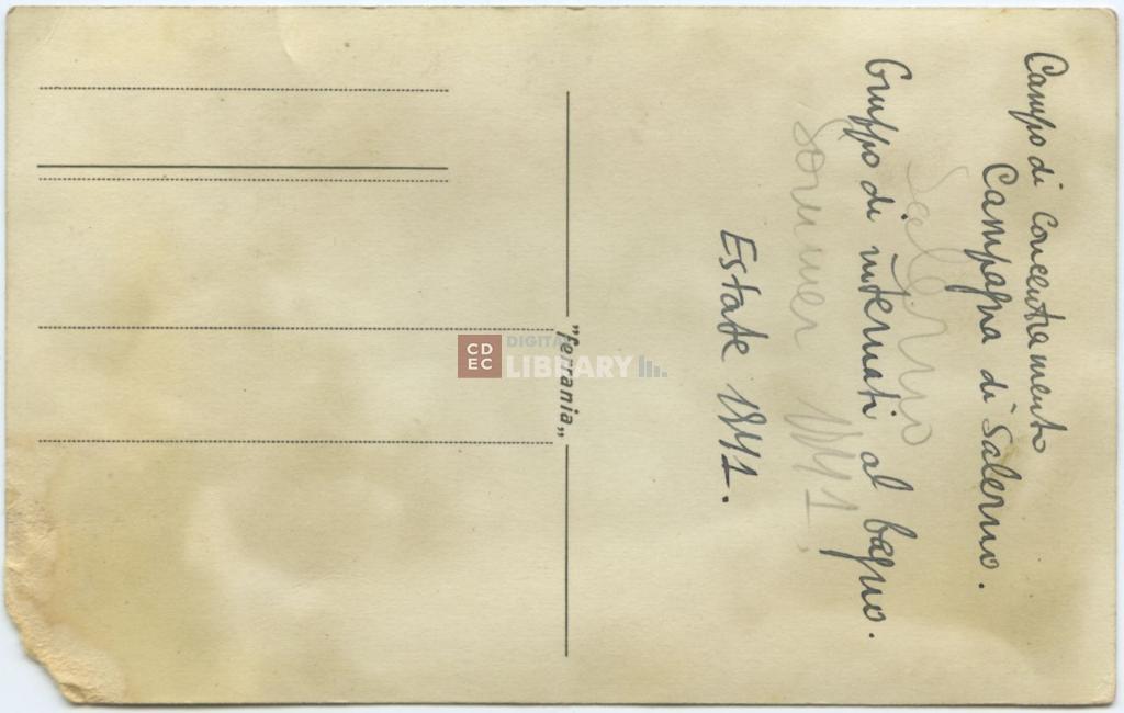 iscrizioni | sul verso del supporto l'indicazione manoscritta a matita "Salerno, Summer 1941" e a penna "Campo di concentramento Campagna di Salerno/ Gruppo di internati al bagno/ Estate 1941" |
