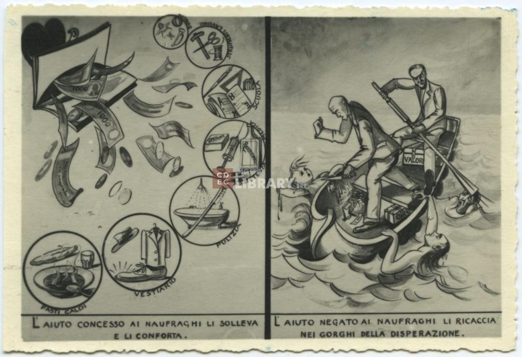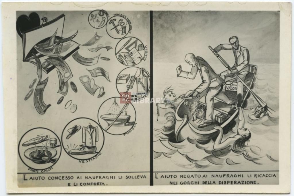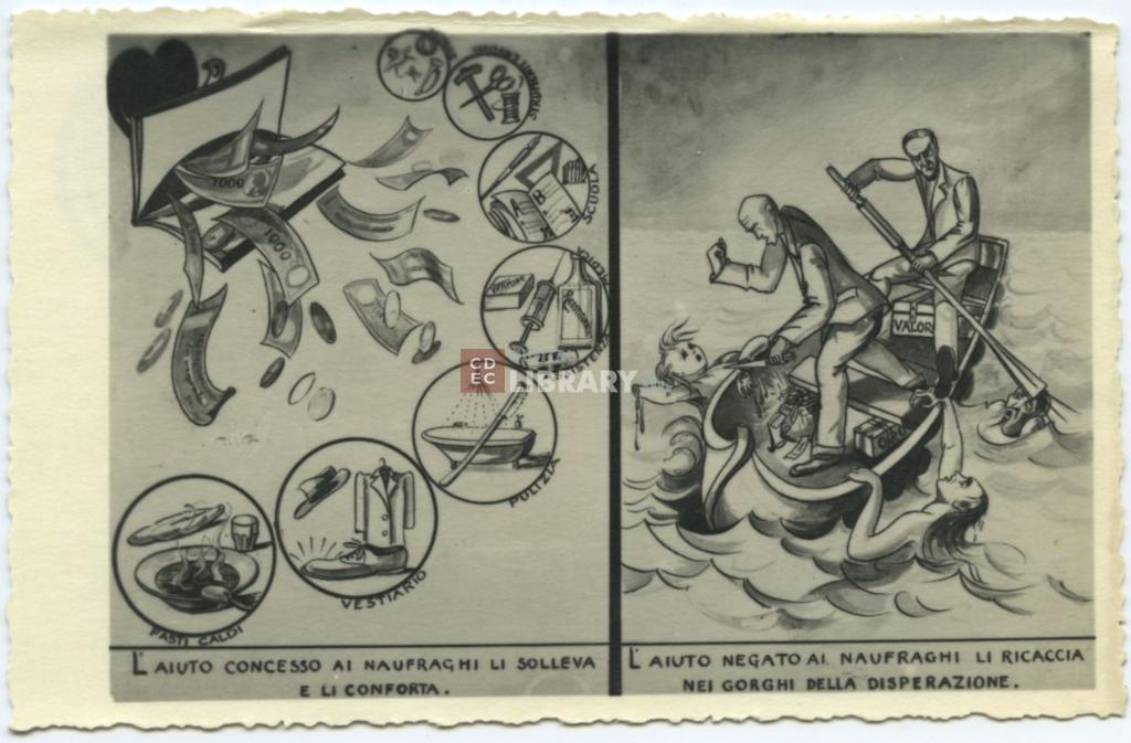 osservazioni | Fotografia allegata alla Circolare n. 22 inviata da Israel Kalk agli oblatori della Mensa. La cartolina evidenzia, attraverso la contrapposizione tra le due immagini rappresentate, come "L'aiuto concesso ai naufraghi li solleva e li conforta" mentre "L'aiuto negato ai naufraghi li ricaccia nei gorghi della disperazione" |