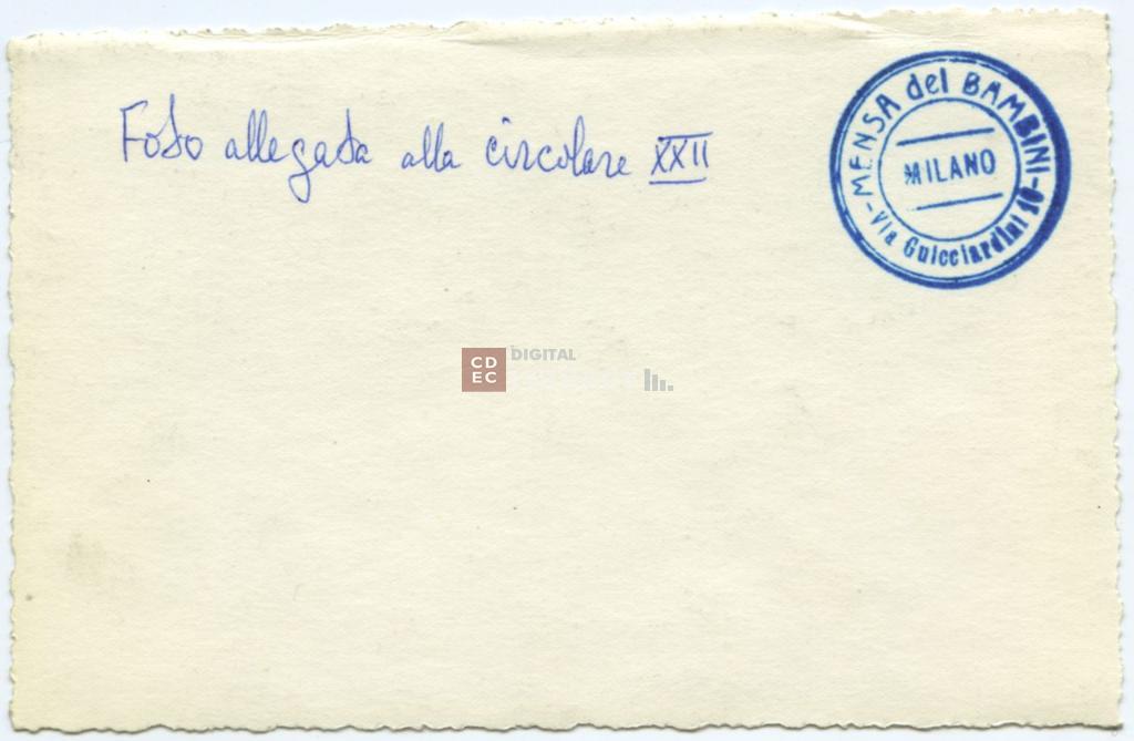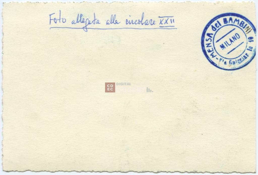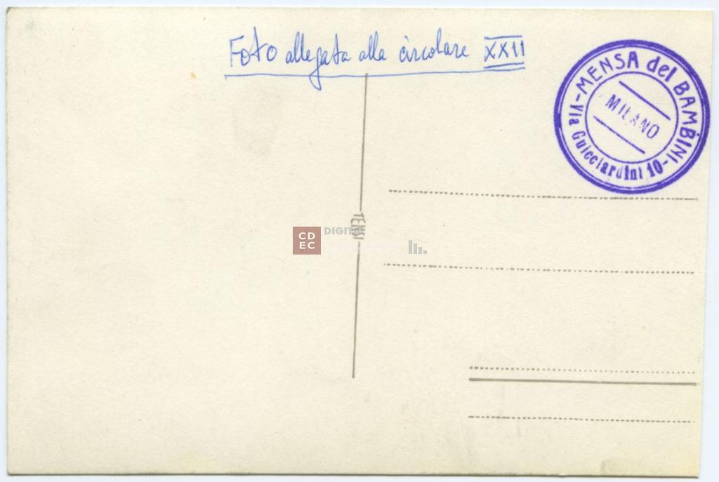timbri, marchi | sul verso del supporto in alto a destra il timbro circolare a inchiostro blu con la scritta lungo il bordo "Mensa dei Bambini - Via Guicciardini 10" e al centro "Milano" |