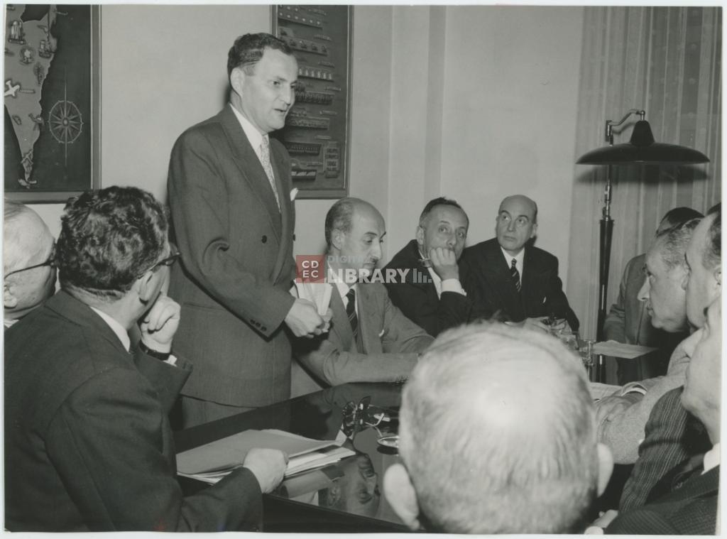 titolo attribuito | Ritratto di Zevì Locker, Giancarlo Viterbo, Astorre Mayer, Marcello Ryser e altri durante l'assemblea generale dei soci della Camera di commercio Italo-Israeliana a Milano |