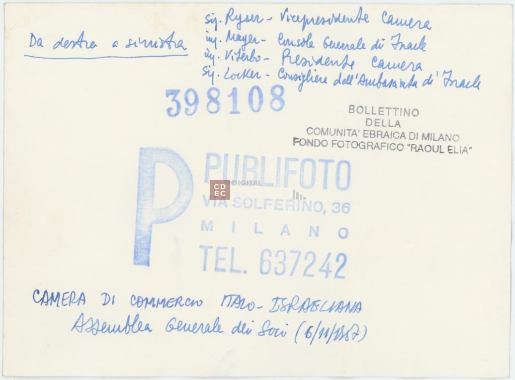 iscrizioni | sul verso del supporto l'iscrizione manoscritta a penna in alto "Da destra a sinistra/ sig. Ryser - Vicepresidente Camera/ ing. Mayer - Console Generale di Israele/ ing. Viterbo - Presidente Camera/ sig. Locker - Consigliere dell'Ambasciata di Israele" e in basso "Camera di commercio Italo-Israeliana/ Assemblea Generale dei Soci (6/11/1957) |