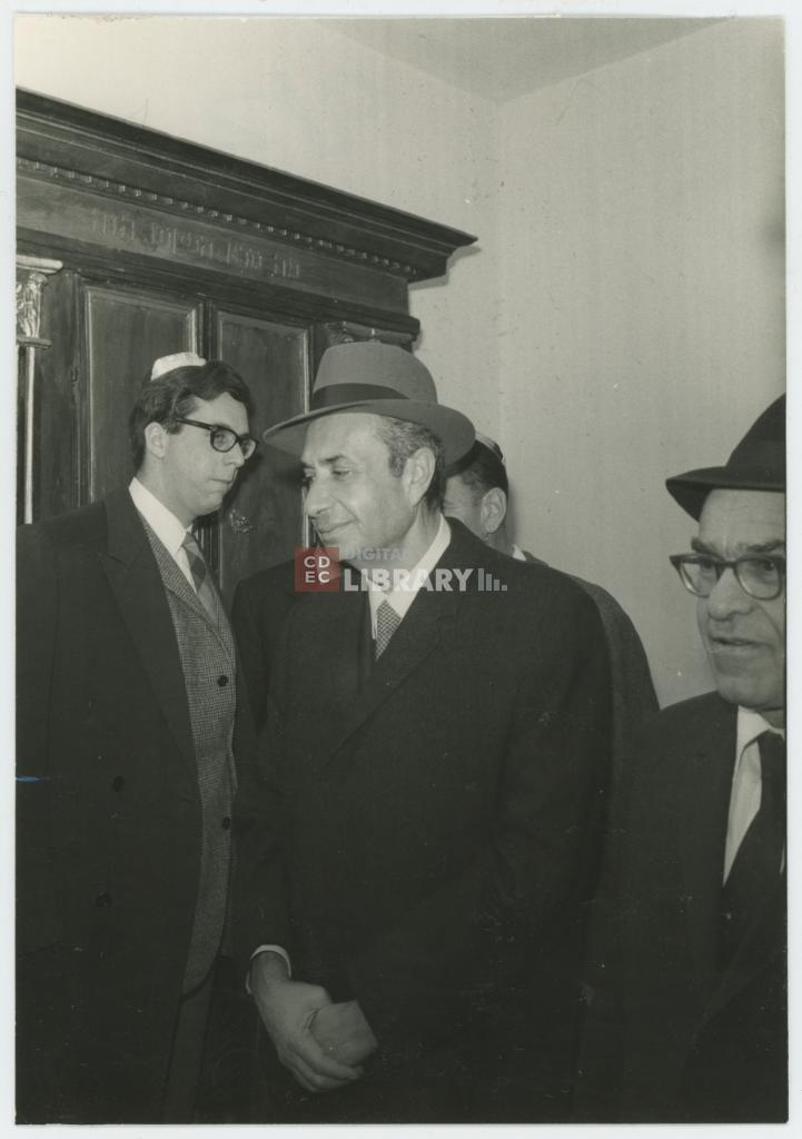 osservazioni | Lo scatto fu eseguito in occasione della visita del Ministro degli Affari esteri italiano Aldo Moro nello Stato d'Israele, che si svolse dal 4 all'8 Marzo 1971. Nella fotografia si riconoscono in piedi al centro l'onorevole Aldo Moro e alla sua sinistra il Ministro israeliano degli Affari Religiosi Zerach Warhaftig. Il gruppo è ritratto davanti al cinquecentesco Aròn Hakòdesh proveniente dall'antica sinagoga di Sabbioneta e trasferito negli anni Settanta del Novecento a Gerusalemme nella Beth Strauss nei pressi del Muro Occidentale. L'iscrizione in ebraico intagliata sulla cornice in alto dell'armadio riprende un passo della Bibbia relativo al sogno di Giacobbe "Com'è tremendo questo luogo" (Genesi 28,17) |