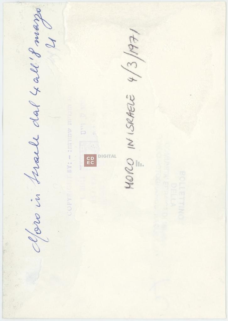 iscrizioni | sul verso del supporto secondario l'iscrizione manoscritta a penna "Moro in Israele dal 4 all'8 marzo 1971/ Moro in Israele 4/3/1971" |